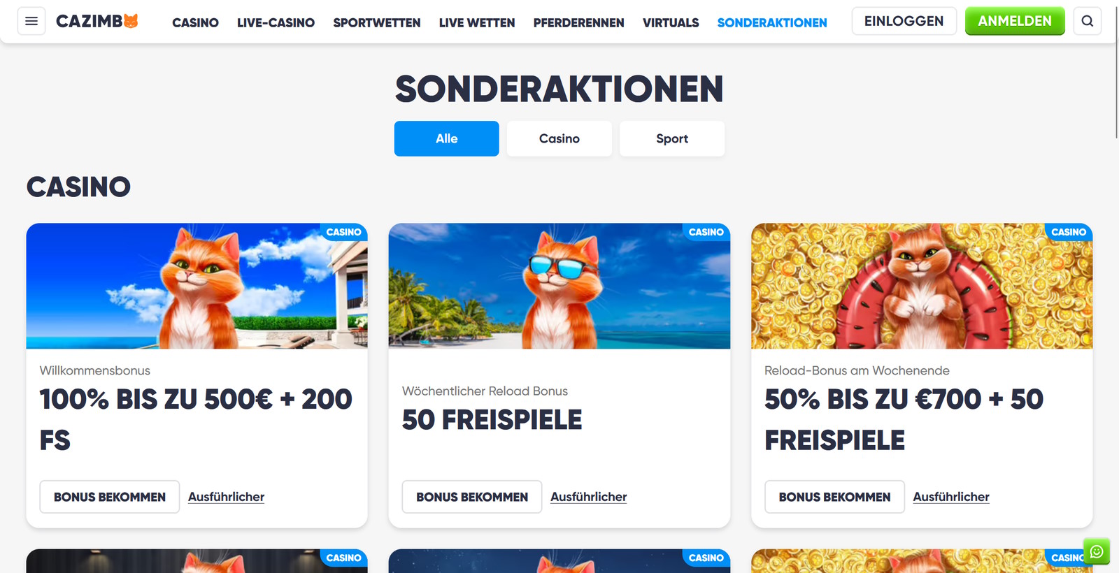 Neben dem Willkommensbonus erwarten euch bei Cazimbo noch eine ganze Reihe weiterer Bonusaktionen. Stammspieler dürfen sich über mehrere Reload-Boni, Cashback Boni und weitere Specials freuen.