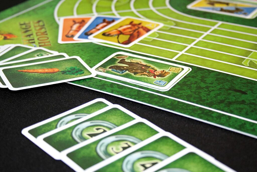 Mit diesen Karten bewegt man die Pferde nach vorne und auf ihr sind immer zwei verschiedene Pferde abgebildet. Für jeden Spieler gibt es einen Satz dieser Karten.