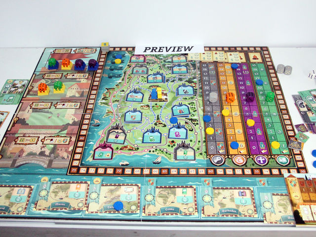 Am Rand des Spielplans ist ein Schloss abgebildet, die Oberstadt, das Zentrum und die Unterstadt. Dort legt man später die Einwohnerkarten aus. In der Mitte des Plans sieht man die Klöster, in der die Spieler später reisen und wo auch die Pilgerkarten ausliegen. Die vier Einflussleisten bestehen aus dem Rat, den Händlern, den Gelehrten und der Kirche. Auf den Feldern am unteren Rand legt man sechs Expeditionskarten aus. Auf der eigenen Spielerablage befinden sich die Münzleiste und die Wachtleiste. Damit bezahlt man im Spiel die gewonnenen Einwohnerkarten.