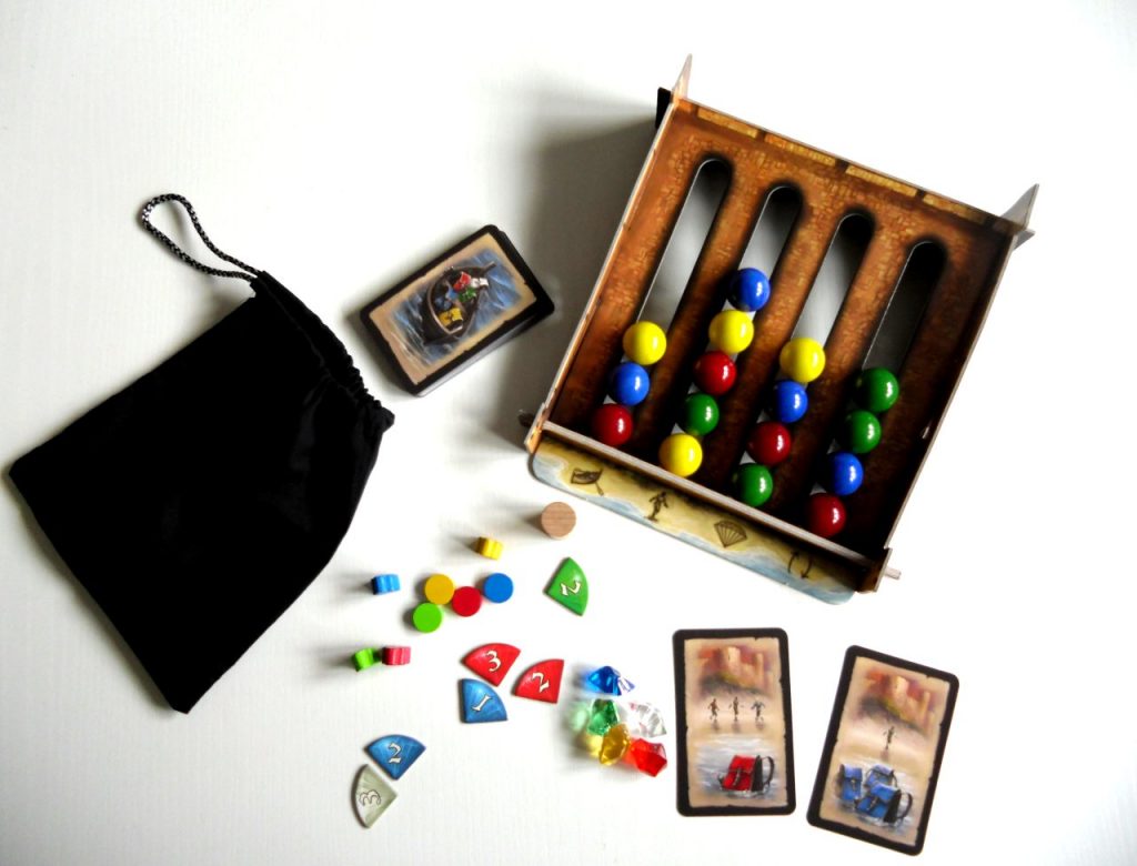 Bei der Wertung überprüft man ob ein Spieler die Mehrheit hat. Herrscht ein Gleichstand unter den Schatzsuchern, dann fängt der an, der weiter oben von der Reihenfolge steht. Die Versorgungskarte kommt zurück auf den Stapel und der Spieler bekommt seine Punkte indem der Wert des Plättchens mit dem Marktwert multipliziert wird. Ungenutzte Schatzplättchen entfernt man aus dem Verlies.