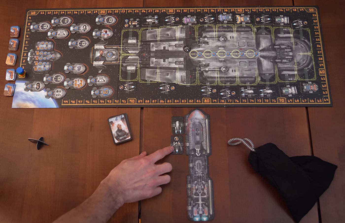 Bei diesem Kapitel dockt man sogenannte Module an die Raumstation und legt an jede Seite zehn kleine Karten aus, die für Bautrupps, Shuttles und Satellitten stehen. Mit diesem Vorgang kann man in den fünf Runden ca. 100 Module verarbeiten. Mit Hilfe der Offizierskarten nehmen die Spieler diese Karten auf und docken sie an den eigenen Frachter links an. Man benutzt praktisch die Offizierskarten als Punktekarten. So bilden sich bei jedem Spieler fünf unterschiedliche lange Modulreihen auf der linken Seite des Frachters. Wie so oft sind natürlich bestimmte Module begehrter wie andere und da kann es mal dazu kommen, dass man die tollen Objekte vor der Nase weggeschnappt bekommt.