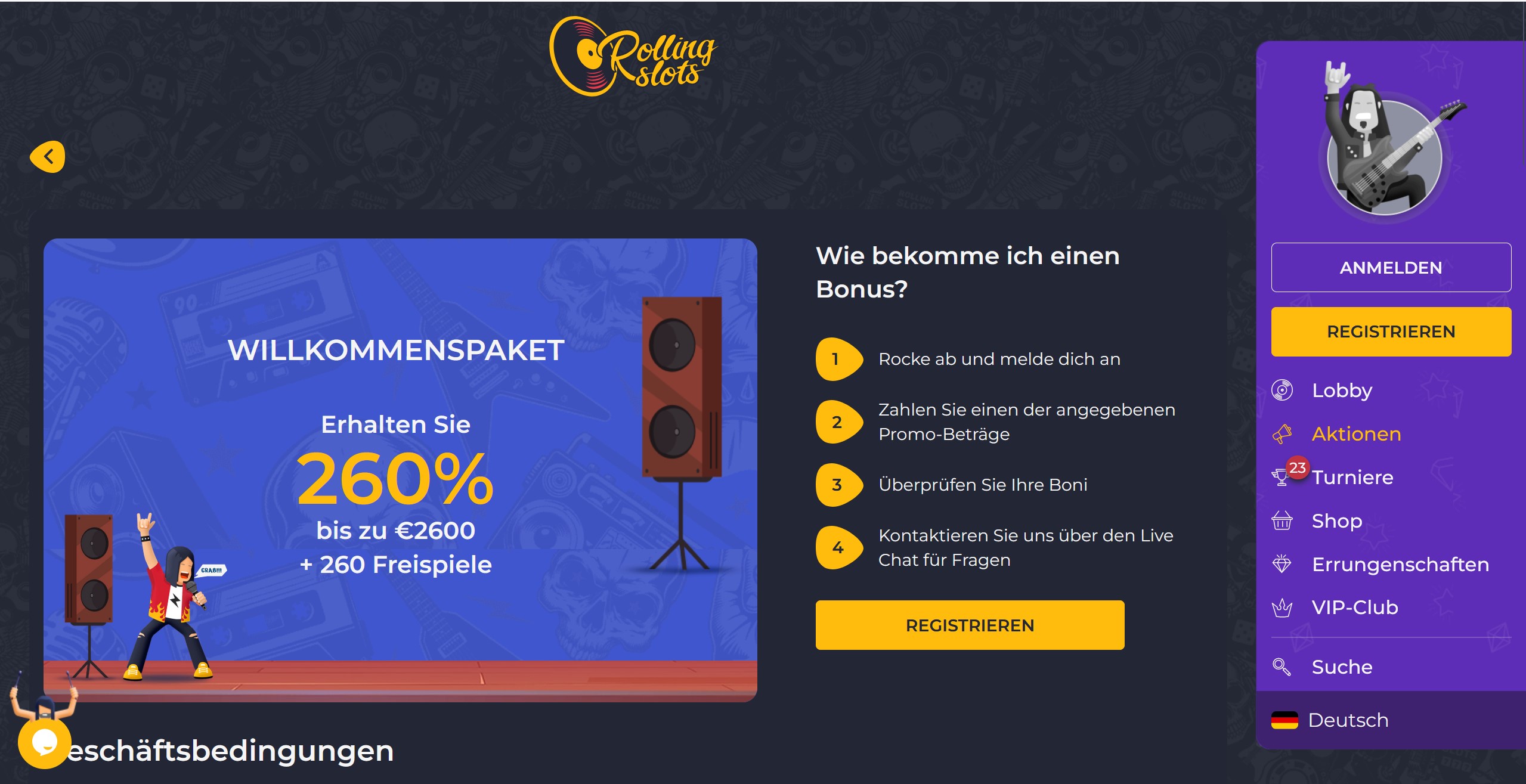 Zunächst wird man aufgefordert, sich den Willkommensbonus zu holen. Immerhin sind es insgesamt 260% Bonusguthaben bis zu einem 2600 € Betrag und 260 zusätzliche Freispiele, die einem den Einstieg ins Casinoleben bei Rolling-Slots versüßen sollen. Mit der Registrierung qualifiziert man sich automatisch für den Bonus mit Einzahlung, dessen erster Teil in Höhe von 500€ und 100 Free Spins direkt bei der Ersteinzahlung von 50 € abgeholt werden kann. Weitere Teile folgen bei den nächsten drei Einzahlungen. Für den Bonus mit Freispielen müssen allerdings mindestens 50 € eingezahlt werden. Ohne Freespins sind nur mindestens 20 € Ersteinzahlung fällig.