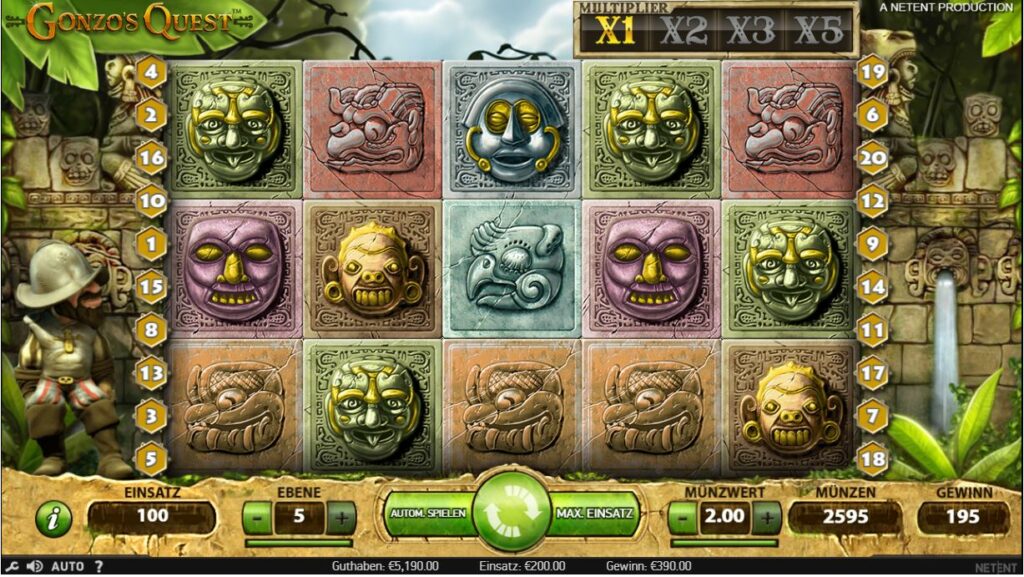 Aber auch von Grund auf hält Gonzo's Quest einiges für interessierte Spieler bereit. So tummeln sich auf 5 Walzen ganze 20 Gewinnlinien, welche somit mehr als reichlich Potenzial für Gewinne liefern. Zu dieser vielversprechenden Ausgangslage kommen allerdings noch mehrere Mechaniken hinzu, welche den Spielspaß weiter erhöhen.